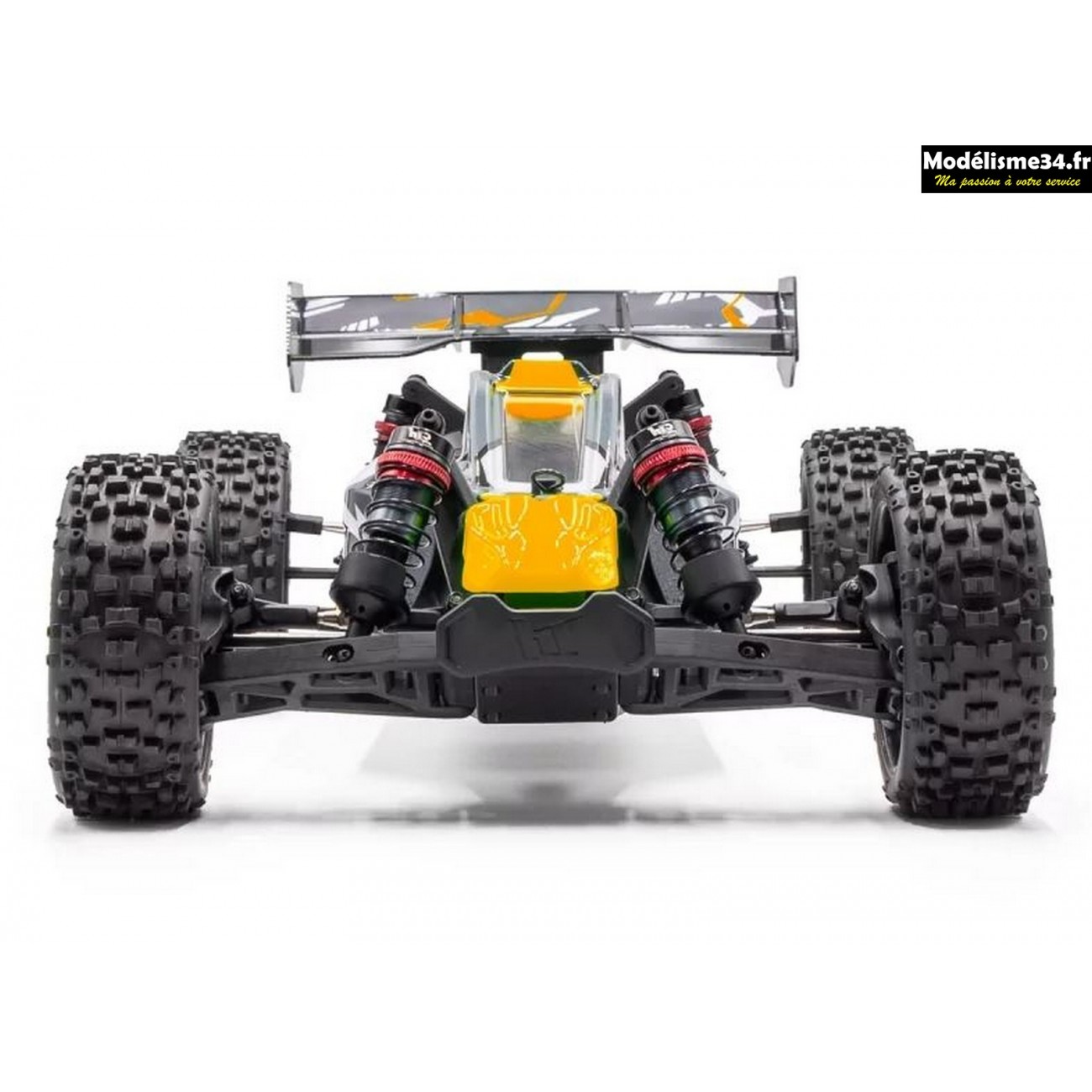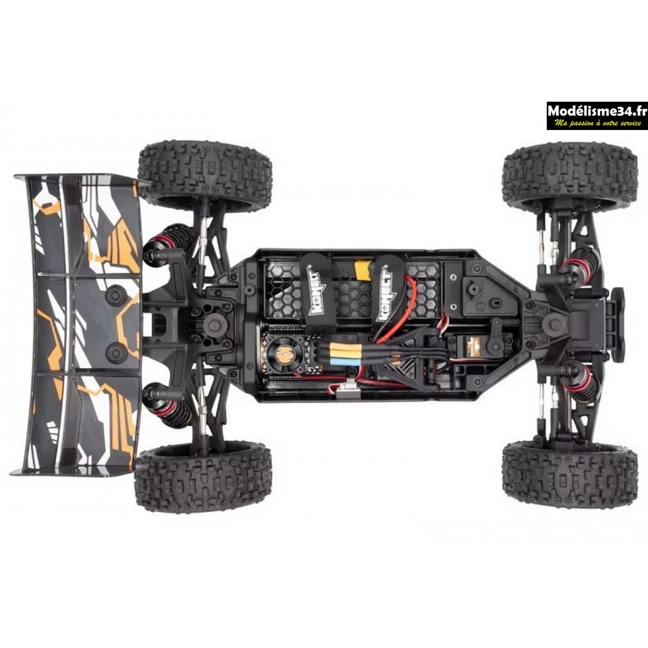 Ce buggy possède une transmission à 4 roues motrices, une électronique Konect by Hobbywing et il est équipé d’amortisseurs big bore entièrement en alu.