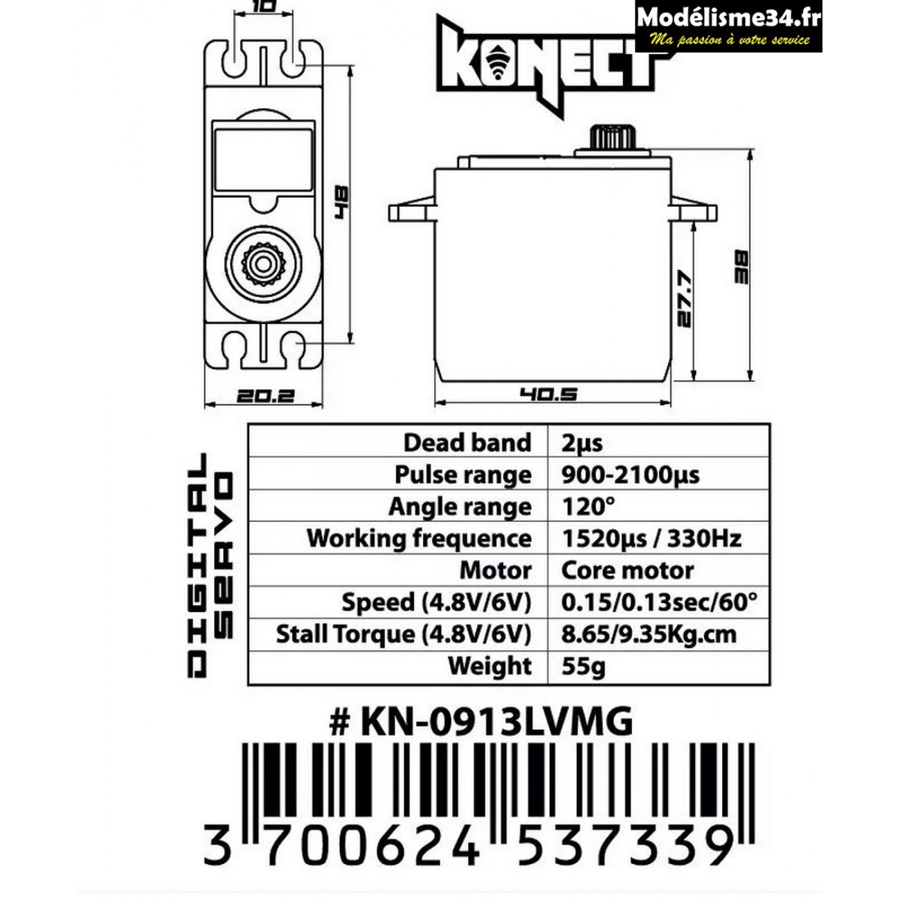 Servo Konect Digital 9kg-013s pignons métal : KN-0913LVMG